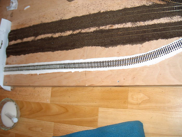 I zaczęło się klejenie na klej polimerowy. Korek do sklejki, tory do korka. To szło szybko. Trzeba było tylko pamiętać o otworach pod rozjazdami do napędów zwrotnic, które miały być zgodnie z założeniami pod makietą.